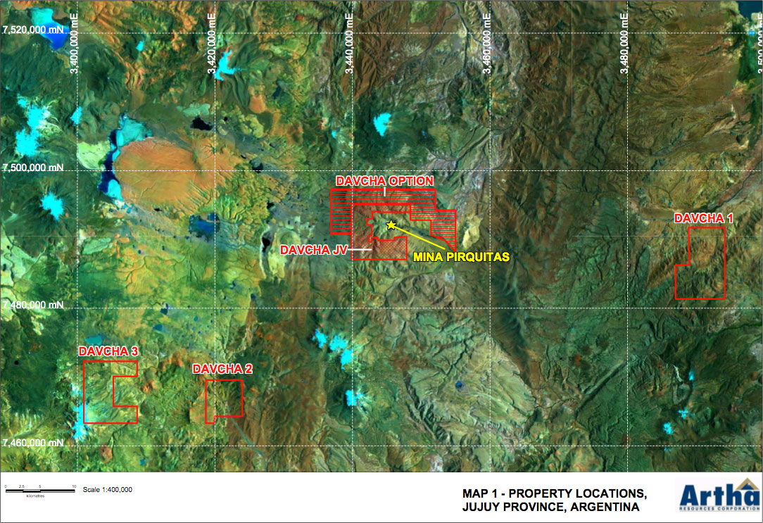 Vancouver, British Columbia - Artha Resources Corporation (TSX.V: AHC) is pleased to announce that the company has entered into an Option to acquire 5 exploration properties, 2 of which adjoin Silver Standard's Pirquitas Mine (see map). The Pirquitas mine was recently completed at a cost in excess of $US220 million, and is expected to produce 10.9 million ounces of silver, 2,500 tonnes of tin, and 6,500 tonnes zinc per year over its 14.5 year mine life, based on current reserves. With proven and probable reserves of 195 million ounces, Silver Standard reports that Pirquitas is the largest silver mine in Argentina and one of the largest primary silver mines in the world. Subject to approval, a NI 43-101 technical report details the 5 properties which cover an area of 25,862 hectares or 100 sq miles. The properties are highly prospective for silver, zinc, tin, gold, uranium and copper.